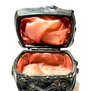 Antique Silver Tone Small Jewelry Trinket Box Casket Hinged Lid Footed Lined is in good condition. The interior lining has started to separate. (see photos).