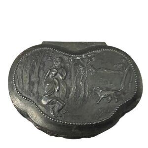 This antique silver-plated trinket box features an exquisite romantic scene on its lid, making it a distinguished piece. Its red velvet interior adds a luxurious touch, perfect for storing small valuables or jewelry. The box's craftsmanship and historic design provide both aesthetic appeal and functional use.