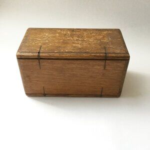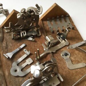 This Singer fold-out wooden puzzle box features finger joints, a brown velvet lining, and all the attachments/accessories you see in the photos. It is likely an incomplete set and I'm unsure if all attachments are original to the set. As found. The text engraved on the box is illegible.