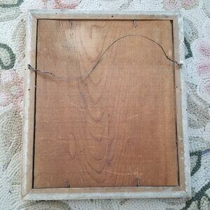 The simple wood frame has glass and a thick coat of very old, crazed white enamel paint that has chipped off in a few places at the top, and all along the right side, that adds to it's aging. The backing is a very thin piece of wood. New screw eyes and wire added.