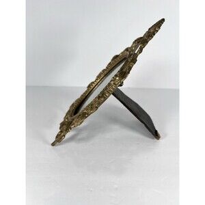 This antique solid brass picture frame features an oval-shaped, Rococo style design with floral patterns and a gold color finish. The frame is made of brass and has an ornate, baroque/rococo style. It is designed for vertical orientation and has a photo capacity of 1, with clear glass for protection. The frame stands free-standing and is less than 10 inches in length, 8.5 inches in height, and 6 inches in width. It is an original piece with a metallic finish, making it a unique and beautifully crafted decorative collectible for displaying photos or artwork.xe