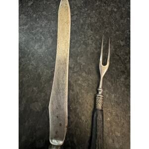 Includes both the carving knife and matching two-tine fork. Perfect for display, rustic kitchen décor, or collectors of antique flatware.