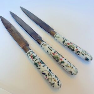 Beautiful 19th century set of three Antique Stahl Bronce Germany Porcelain Handled Fruit Knives. are in great condition, no chips or cracks, excellent antique condition. Perfect for fruit, cheese, & other charcuterie. Hand painted flowers and birds on the porcelain handles. Brass blades stamped Stahl Bronce. Made in Germany. 6.3” long