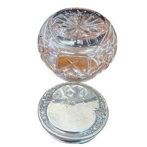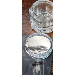 Details: Top tests as Sterling Silver. Cut Crystal jar. Sterling Silver powder pot. The top is not marked tests as sterling. Monogramed with S on lid. 3 inches