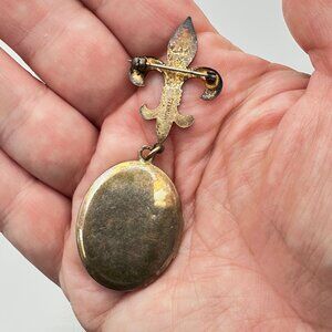 Antique Sterling Silver Yellow Guilloche Fleur De Lis Picture Locket Pin Brooch