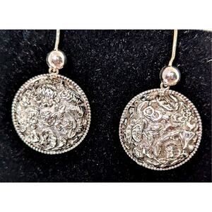 These earrings have been in my possession for over 60 years domed carved and hammered with amazing precision.Last 2 photos are the backs.