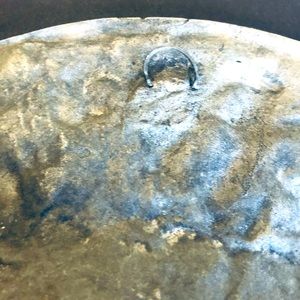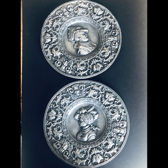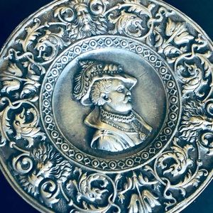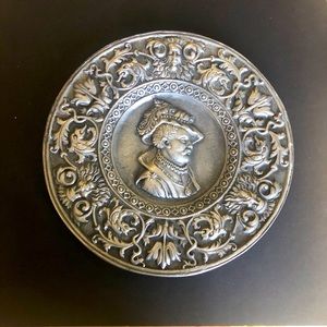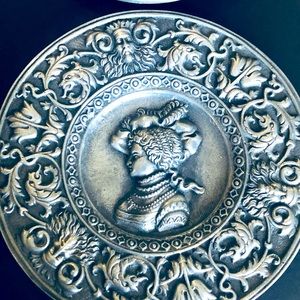 Antique Style Green Man Portrait of Cast Metal Charger Plate Wall Plaque Antique Medieval Style Metal Plate Charger Plaque (Reproduction) Circa 1990s Great used condition, no chips, cracks or repairs detected. Made from a heavy cast metal alloy .