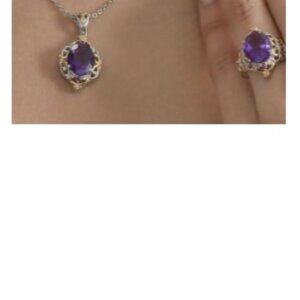 The ring and pendant set has an antique style that looks like a Victorian design. The main stone for both the ring and pendant is a large African Amethyst. Each piece has two Orissa Rhodolite Garnets accenting the top and bottom. The African Amethyst gemstones are a deep purple. The Orissa Rhodolite Garnet gemstones are reddish in color. The Pendant Necklace is 20 Inches long. The ring is a size 7. Both are ION Plated YG and Stainless Steel.