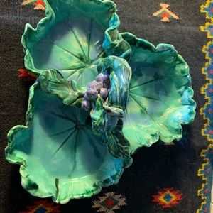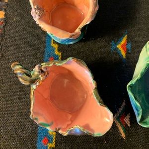 This beautiful handcrafted tea set includes a tea pot, cream and sugar bowls and a biscuit bowl with a handle. It is signed “Lola B” and uses a soft teal color on the exterior with pink accents on interiors, which really work well. This was made in 1949, and is in excellent condition.