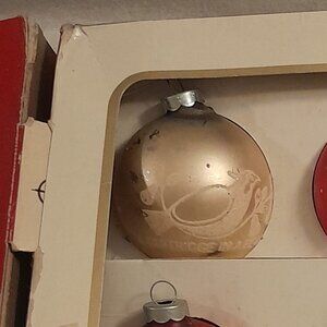 By "Shiny Brite" 1969. Mercury glass in original box. Glitter images intact but I have not cleaned them. Really good shape for being old and found in a barn. Probably won"t find many of this set. Ornament "1 is a bit dark under hanger, again, I did minimal cleaning.