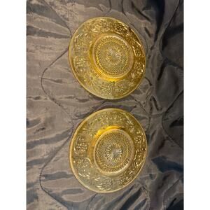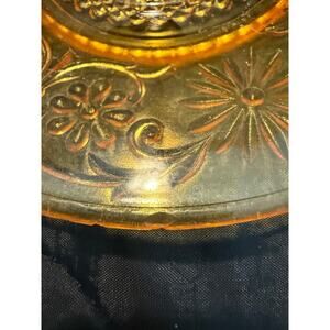This antique Tiara Indiana Glass daisy amber gold sandwich dessert plate is a vintage piece made in the United States. The pressed glass plate features a round shape with a glossy finish and a flower theme, perfect for adding a touch of elegance to any dining table. Hand wash only to preserve its original beauty, this 7" dessert plate is a unique addition to any collection of decorative cookware and serveware.