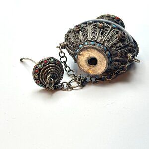 A charming Tibetan snuff bottle from the 1930s-40s era, when finely ground tobacco was a cherished part of daily life in Tibet. These bottles were designed to keep precious tobacco dry in the high Himalayan climate, with the attached spoon used to measure out just the right amount. Features traditional turquoise and coral inlays common to Tibetan crafts. The symbolic lotus flower detail at the base and original chain-attached spoon remain intact.
