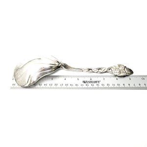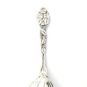 Tiffany's Strawberry pattern was introduced in the the early 1900s. This spoon features the strawberry pattern handle with a kidney shaped bowl.