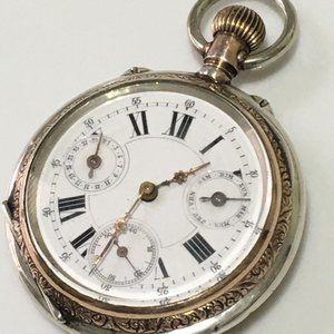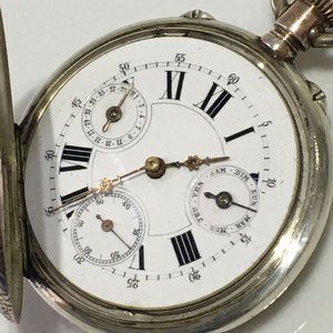 Antique Tissot QUANTIEME AEMDNTDIA 10 Cylindre Geneve Calendar silver pocket watch Runs, everything looks very good and works in this watch . Crystal and dial looks fine as a gold inlay around , cases made of solid silver 800 or higher not marked but tested . Size of the watch 63 mm x 49 mm total weight 80.2 g The case of the watch has some scratches and some little nicks as shown in the photo please examine all the photos or ask any question regarding this item before purchasing,