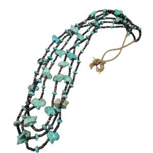 Antique Turquoise Carved Animal Stations Heshi Necklace Multistrand 24" Detailed