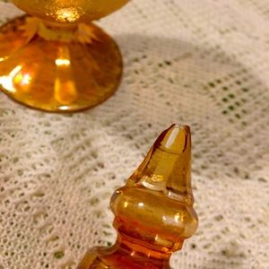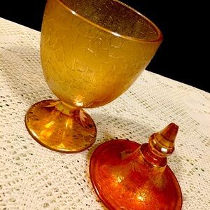 5”x2 1/4” Terracotta fire glazed lidded box, hand painted ivy leafs. 2 Avon ‘A Wild Rose’ cologne 4”x1” both over half full. Crackled marigold lidded compost dish. 7.5”x3.5” Lid has a chip on the tip.