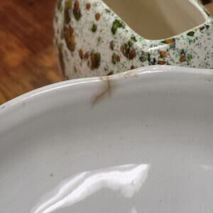 The dish has some crazing and areas that are discolored/staining consistent with age. There is a small crack on lip (see pictures)