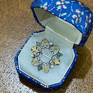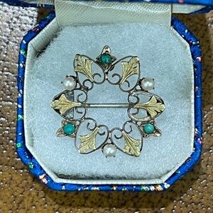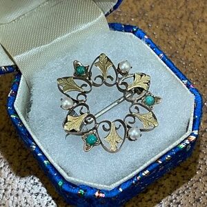 Antique Victorian 10k Yellow Gold Turquoise Pearl Ivy Leaf Wreath Brooch