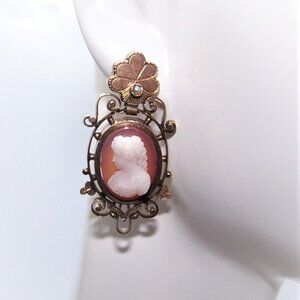 Genuine C.1890 VICTORIAN antique earrings! Yep, the real deal. Made of 14K Rose Gold (tested, not marked) a lady decided to convert the screwback findings to pierced earrings and found a jeweler to do the conversion as cleanly as possible - only problem was, the gent couldn't match up the rose gold to the findings - he used 14K Yellow Gold (hallmarked as pictured) findings (which, of course, can't be seen from the front). The earrings are true left and right pieces and the center cameo is carved from sardonyx agate aka hardstone - in this case colors of caramel and white. The carving is very nicely done with no chipped noses. A single creamy/gray pearl is set in the "shell-like" top section. Length is 1-5/16" x 11/16"; combined weight of the pair is 8.2 grams. The earrings are presented as I found them - I did not polish the top rose gold just in case the new owners want their Victorian era pieces to LOOK Victorian era (in other words, no high shine). Absolutely gorgeous!