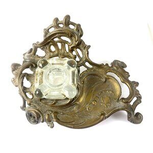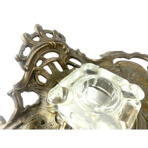Antique Victorian Brass & Glass Inkwell Holder Desk Accessory With Ornate Design