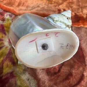 A unique example of Victorian-era decorative arts, this is an antique piece carved shell with mother of pearl or abalone natural lining, functioning as a multi-purpose decorative and utilitarian item. It presents as a small, open container, likely used historically as a string holder, or potentially a salt cellar or caviar bowl, and is classified as a Victorian curio. The shell's surface exhibits intricate carving, indicative of hand-craftsmanship from the period. Its natural iridescent quality is a prominent feature, showcasing the shell's inherent beauty. The interior cavity suggests a capacity for holding small items, such as string with the slot on. the back for small scissors, or granular substances like salt or caviar, with the slot being for a serving spoon. The piece's diminutive size and detailed carving classify it as a collectible, suitable for display in a curio cabinet or as an accent piece. The antique nature of the item is evident in the material's patina and the style of the carving. Due to its age, there may be signs of wear consistent with its historical use.
