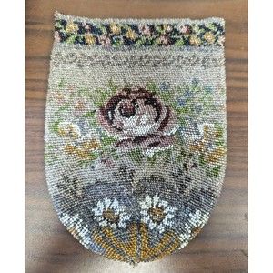Antique Victorian Colorful Floral Rose Glass Micro Beads Drawstring Purse 1920's