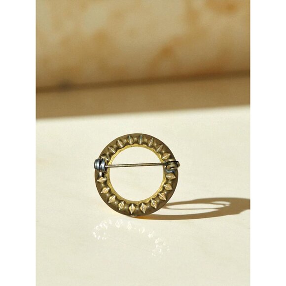 Step back in time with this elegant Antique Victorian Round Brooch, featuring a dazzling circle of faceted crystal stones set in a warm brass-tone frame. Measuring 1 inch in diameter, this petite pin is a beautiful example of 19th-century design, complete with an early C-clasp closure that reflects its true vintage charm.