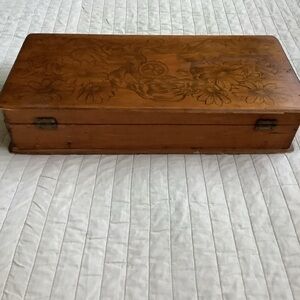 Antique Victorian wooden glove box from late 1800’s to early 1900’s. Decorated with the pyrography method that was popular at the time. This one depicts a girl with long hair surrounded by flowers. These boxes were usually given as gifts. Has a brass latch and hinges. In excellent condition