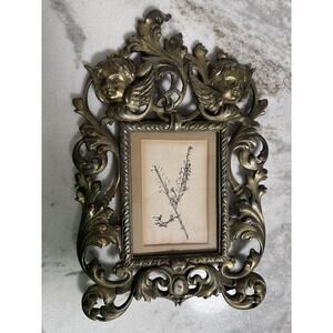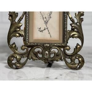 Beautiful antique Victorian heavy brass art nouveau style angels/cherubs picture frame stand. Measures 12.5 by 8.5 inches. Inside diameter measures approximately 5.5 by 4 inches. Numbered 363 on the back. Some patina around frame shown in photos from age. Very nice estate find from a lady who had a “Fenton glassware” retail shop. (#787)