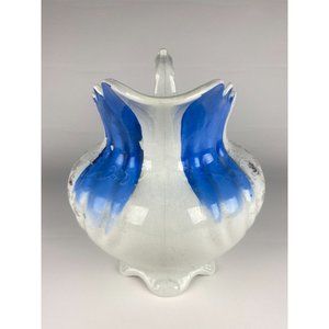 Structurally sound. No chips. There is moderate crazing throughout. Pitcher sits flat. There are fissures forming in a few spots on pitcher, most notably at front and back of handle and at bottom of interior of pitcher, as shown. The blue paint has chipped off in a few areas on exterior. Some detail cleaning could be needed in between some of the ribs on exterior of pitcher.