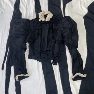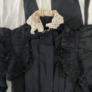 Antique Victorian 1890s Black Silk Dramatic Leg of Mutton Sleeve Mourning Bodice with Jet Beads and Embroidered Lace Collar. Fully lined and boned (lining appears to be a very fine glazed cotton.) Sleeve supports at shoulders. Hook and eyes at neck and at bow at waist. Buttons down the front.