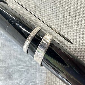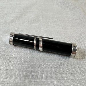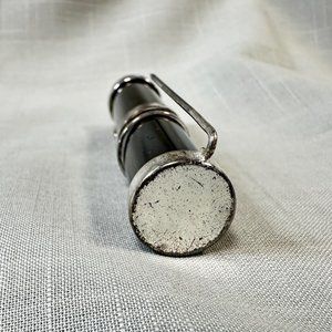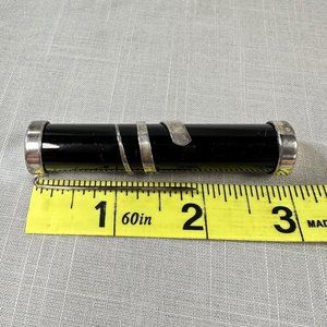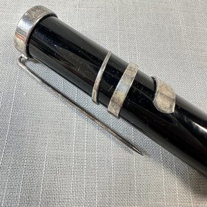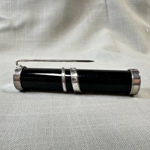 This unique and rare piece appears to be made out of a cylindrical bar of solid Onyx, capped with silver (likely sterling) on each end, with a decorative graduated swirl around the center. The swirl is not firmly attached and can rotate around the piece. There is a long pin on one end of the caps. This is a large and heavy pin, measuring 3" long and just over 1/2" in diameter. Could be worn by men or women, this piece may have been specifically crafted using an object beloved by the decedent. It is in very good shape for it's age, which is most likely from the 1870s-1890s. Not marked.