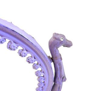 Antique Victorian cast iron swivel mirror stand frame. There is no mirror. It can be used as a mirror with a new round mirror, a photo frame, art frame, or as-is piece of decor. Beautiful original lavender color, distressed, with a cherub on the top and dragons on the sides. Heavy. The measurements are 10.5"X6.5"X15.5"H. Good for a mirror or image of 7.5"X8". Great for a person who likes whimsical, unorthodox, elven decor.
