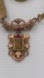 This stunning Victorian cameo necklace features an ornate center medallion exquisitely crafted in rose and yellow gold filled metal. The design is layered, and accented with sparkling red stones. The carved genuine tiger eye cameo is in profile, a lady with an ornate hair style. The clasp is hidden, inserting on the side of the center piece for a seamless look and is quite secure. The mesh chain is yellow gold filled. Other than light wear to the back, this Victorian beauty is in excellent condition. The necklace measures 20", the central cameo medallion drops 2" and measures 1 3/4" across the top piece.