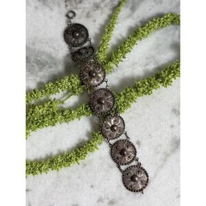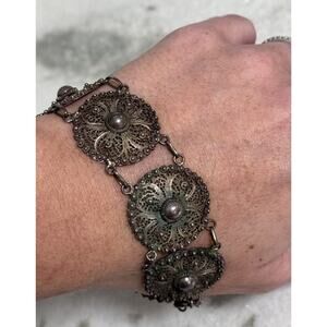 Antique Victorian sterling silver tested filigree flower design bracelet. Bracelet measures just over 7.5 inches long. Flower designs measure 1 inches diameter. Beautiful old piece early 1900s with incredible filigree detail. Some patina from age shown in photos. No flaws noted. Very well cared for. (#989)