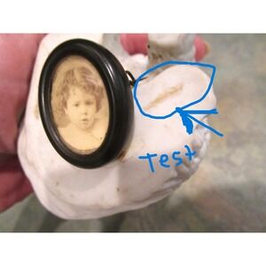 So adorable is this photo/hair locket, oval frame with hinged door on reverse metal backing. Open C clasp. Clear plastic over front photo. Measures about 37mm x 30mm x 8mm depth not including pin hardware. 9.76grams.