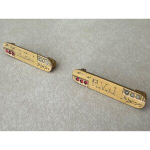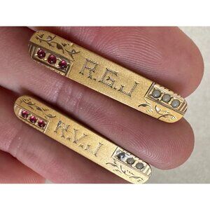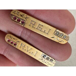 Excellent antique condition, these are in remarkable shape after all this time. Each pin features 3 seed pearls or milk glass cabochons and 3 red. Engraved with R.G.J and R.V.J. and delicate florals. Both clasps function perfectly. Please see photos for measurements.