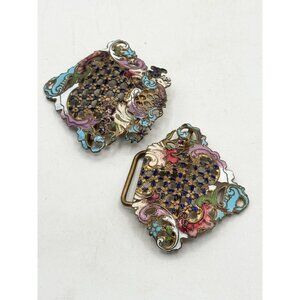 Antique Victorian enamel interlocking belt buckle. Brass buckle with colorful enamel, two pieces interlocking. Super well made with colorful enamel. Antique belt buckle. MN54GH.
