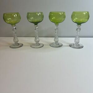 This antique wine glass set of 4 from Villeroy & Boch features beautiful floral scrollwork and a clear, vintage design. The glass is 6.75 inches tall and has a round shape, making it perfect for all occasions. The etched and decorative features add to its charm, and the production style is cut glass. This glass is a perfect addition to any collection and is sure to impress. The brand is well-known and respected in the world of fine drinkware. The wine glass is suitable for unisex adults and is perfect for any Victorian-style setting. The theme of the glass is European and floral, with a touch of Gothic style. This wine glass is a true gem for collectors and enthusiasts alike. They are antique except for standard ware and tare. There is some cloudiness in the hollow clear-cut stems.