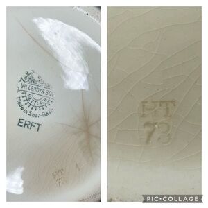 Antique Villeroy & Boch Wash Stand Set Pitcher, Basin and Soap Tray Ivory Gold - made in SAAR Basin (circa 1920-1935) Soap holder is unknown brand, has no maker stamp. This set is antique and has some very visible water markings, stains and dark spots. This item is heavy, additional shipping charge is included in price.