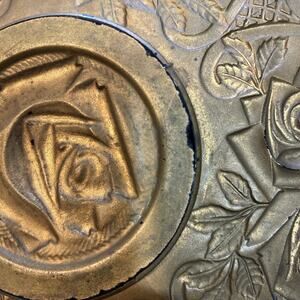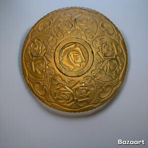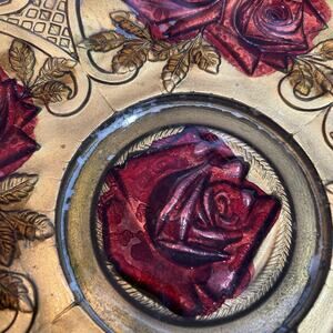 This antique collector plate is a stunning piece of art from the 1920s. The beautiful roses pattern is painted in red and gold, creating a captivating effect that will surely draw attention. Made of glass, this platter is perfect for displaying and can be a great addition to any collection. The item measures 10 3/4" and is a perfect representation of American culture during that time period.