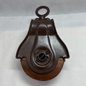 Antique Vintage Cast Iron & Wood Barn Pulley. Approximately 12" tall with a 5" wood wheel. Lovingly restored and in great condition. Use as a pulley for plants, etc.; or as rustic decor piece for a modern farmhouse, high-end garage, man cave, dude den.