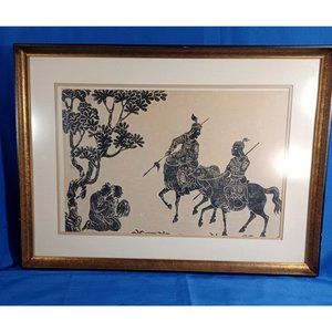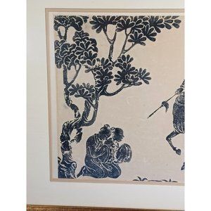This item came from an estate auction. I am told this is an antique carved wood print of the Hun invasion of China. This art depicts angry soldiers on horses and begging peasants near a sacred tree. It's quite an alarming piece that captures a very sad moment in human history. It is stamped on some kind of fabric. It is matted and framed. It looks better in person!