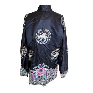 Nehru collar and satin frog closure down front to close this beautifully hand embroidered bird and floral motifs in pink, lavender and pale green decorate this traditional robe style Chinese jacket.