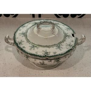 This is an antique soup tureen from John Maddock & Sons in the Hamilton Green Royal Vitreous pattern. This round tureen is a beautiful piece of history and would be a great addition to any collection or table setting. Perfect for serving soups, stews, or other dishes, this tureen combines functionality with vintage charm. The green Royal Vitreous finish adds a touch of elegance and sophistication.