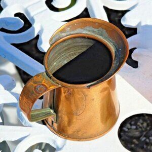 Antique Vintage New York Stamp Handcrafted Copper Pitcher 2.75"x2.25". This vintage Copper Pitcher is a unique piece with BUD....WESTERMA...50 VESE...NEW YORK stamp. Add timeless charm to your home with this beautiful vintage copper pitcher featuring a rich, warm patina and artisan detailing. This is perfect on your outdoor patio, in your garden or adding a touch of warmth to your home as a decorative piece, table centerpiece, or wall décor. Ideal for vintage collectors or anyone who appreciates copper metalwork. With its unique and rustic appearance, this tray is a rare and collectible piece of metalware that adds a touch of vintage charm to any home or collection. Approximate Measurements: 2.75"x2.25"