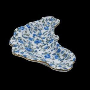 This beautiful blue & white chintz bone dish with gold trim would make a great trinket dish.
