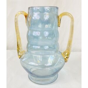 Beautiful vase in terrific condition. I cannot find another like it. It may originally have had a lid and been a decanter, I’m just not sure. Approx 9.5” tall. Blue glass with yellow gold handles and a slight iridescent sheen.