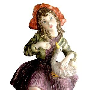 2 lovely faced children with the typical "Italian Eyes" and curls dressed in dramatic jeweltone period costumes in colors of green, purple and gold and red hats. The girl is holding a duck or goose and the boy has a mischievous look on his face.