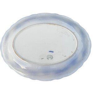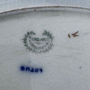 antique flow blue, english porcelain, lotus mark, blue white dish, collectible ceramic, ornate tableware, historical pottery, decorative plate, victorian era, vintage serving platter